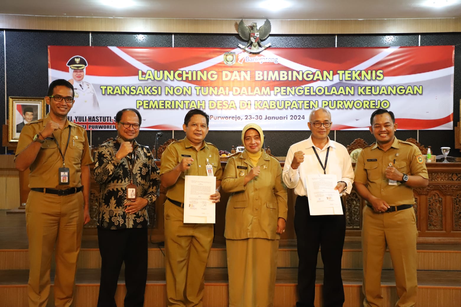 PURWOREJO, RealitaPublik – Bupati Purworejo Hj Yuli Hastuti SH melaunching implementasi Transaksi Non Tunai dan membuka Bimtek Penggunaan Aplikasi Siskeudes Link Terintegrasi CMS Pemda–Bank Jateng bagi Pemerintah Desa di Kabupaten Purworejo. Dalam acara ini, juga dilaksanakan penandatanganan MoU antara Dinas DPPPAPMD dan Bank Jateng di Ruang Arahiwang Setda Pemkab Purworejo, Selasa (23/1/2024).