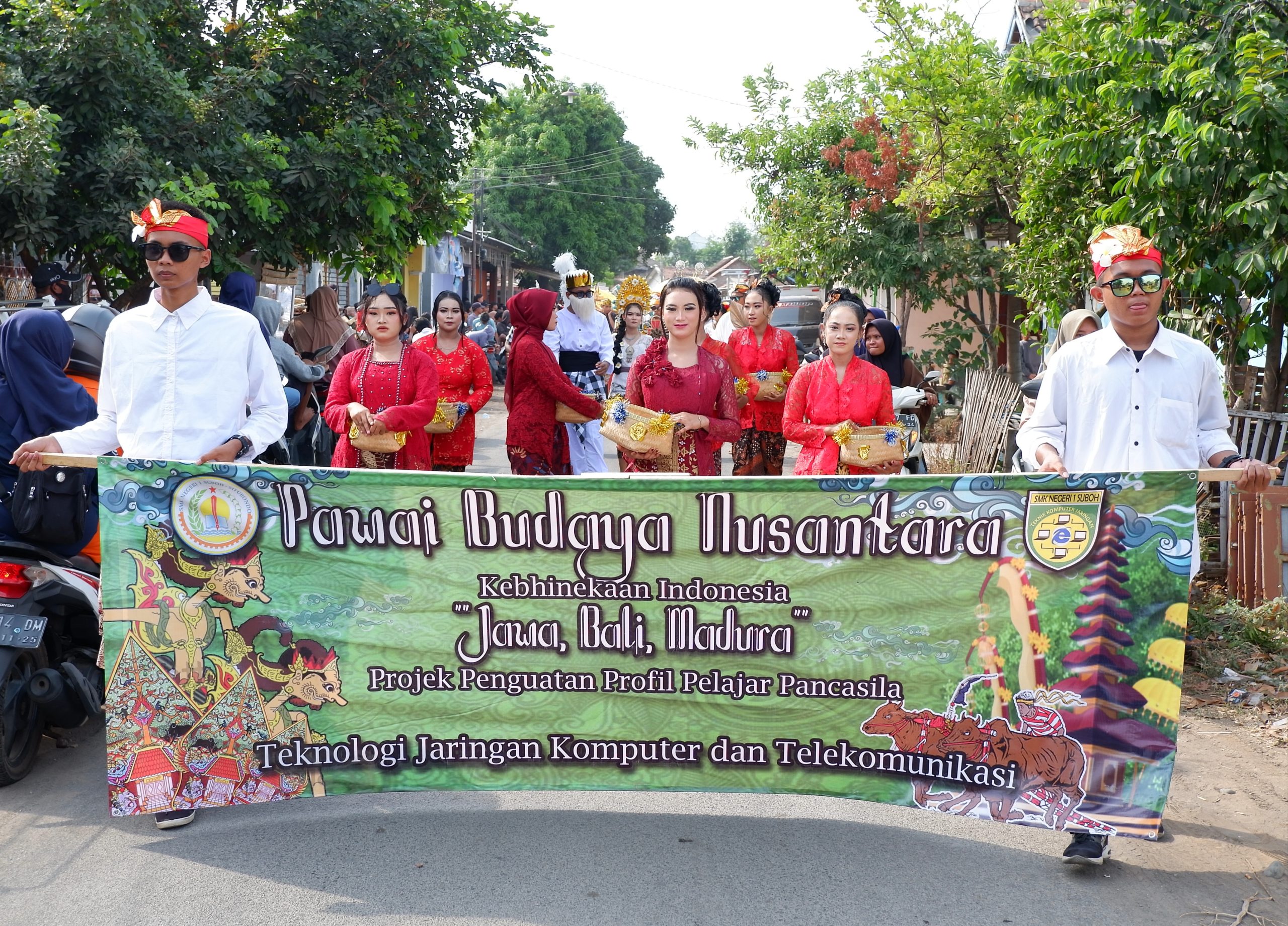Pawai budaya SMKN 1 Suboh dalam kegiatan P5 ini menampilkan berbagai budaya di Indonesia, diantaranya budaya Komantan Korong, budaya Siraman, Budaya Bali, budaya Karapan Sapi, dan budaya petik laut.