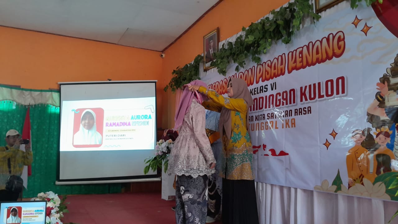 Pada kegiatan pelepasan tersebut Kepala SDN Negeri 1 Mlandingan Kulon menyematkan kalung tanda kelulusan kepada siswa kelas 6.