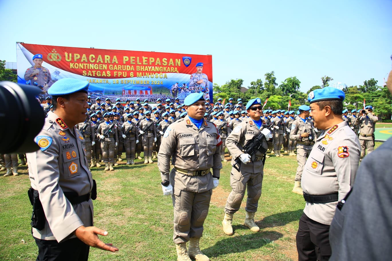 Realitapublik.id Jakarta – Wakapolri Komjen Pol Agus Andrianto memimpin upacara pelepasan kontingen Garuda Bhayangkara Satuan Tugas Formed Police Unit (FPU) 6 MINUSCA dalam penugasan misi pemeliharaan perdamaian PBB ke negara Afrika Tengah. Upacara dilaksanakan di lapangan Bhayangkara Mabes Polri, Jakarta, Rabu (18/9/2024).