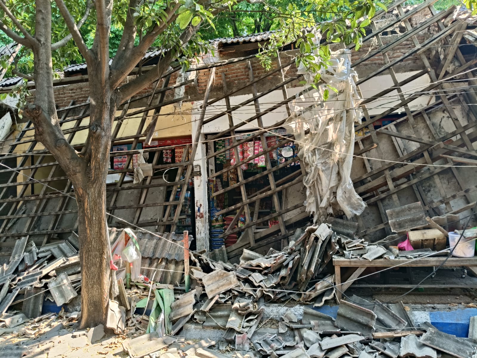 “Tiba-tiba saya dengar suaranya ‘bruuuk’ gitu, ada debu, saya kira apa yang jatuh, ternyata atap genting depan saya yang ambruk,” katanya di lokasi kejadian