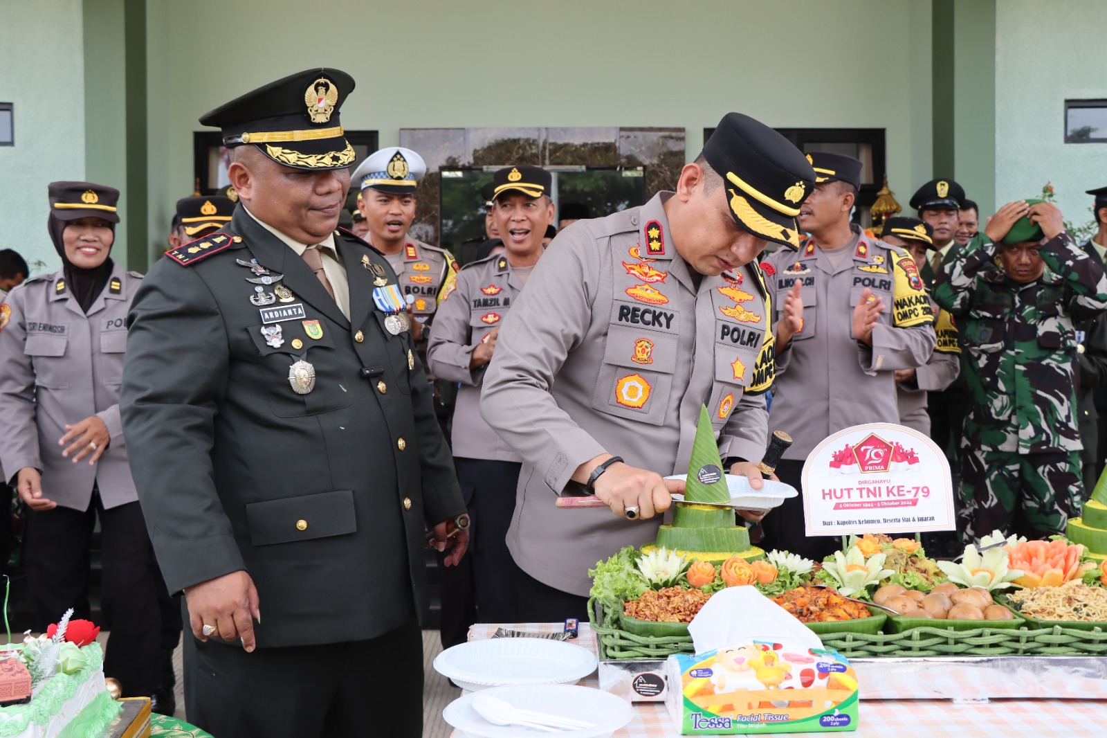 Acara berjalan penuh keakraban. Terlihat AKBP Recky memotong tumpeng nasi kuning dan memberikan suapan kepada Letkol Czi Ardianta yang diikuti riuh tepuk tangan dan saling mendoakan.