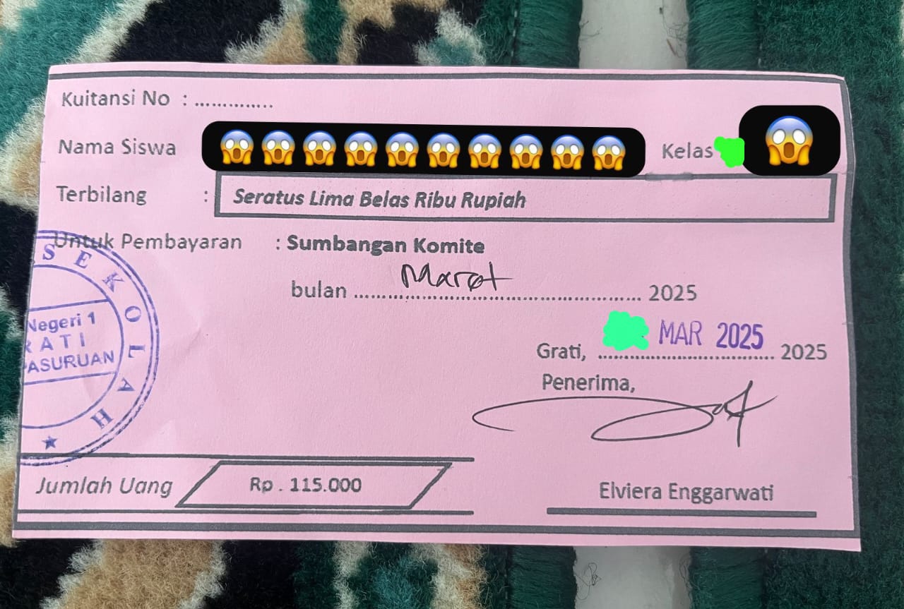 PASURUAN, realitapublik.id — SMAN 1 Grati, Kabupaten Pasuruan, menjadi sorotan setelah muncul dugaan pungutan liar (pungli) berkedok sumbangan komite sekolah. Para siswa diminta membayar Rp 115.000 per bulan, atau sekitar Rp 1.380.000 per tahun, sebagai syarat untuk mendapatkan kartu ujian. Jika tidak membayar, siswa dikabarkan tidak dapat mengikuti ujian.