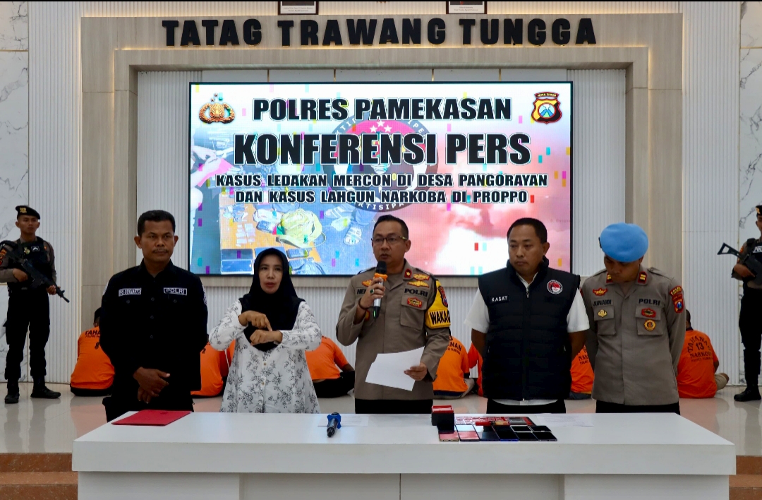 Wakapolres Pamekasan Kompol Hendry Soelistiawan saat konferensi pers di Gedung Tatag Trawang Tungga, mengatakan dari hasil penggeledahan, petugas berhasil mengamankan 3 (tiga) tersangka penyalahgunaan narkoba jenis sabu.
