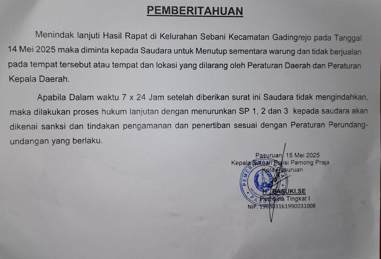KOTA PASURUAN realitapublik.id – Polemik Warkop Sebani memang sedang memanas, dan nasib mereka masih belum jelas. Berdasarkan informasi yang tersedia, pihak Satpol-PP telah memberikan surat edaran untuk menutup sementara warung-warung yang menjadi sorotan sambil menunggu keputusan lanjutan dari Pemkot Pasuruan.