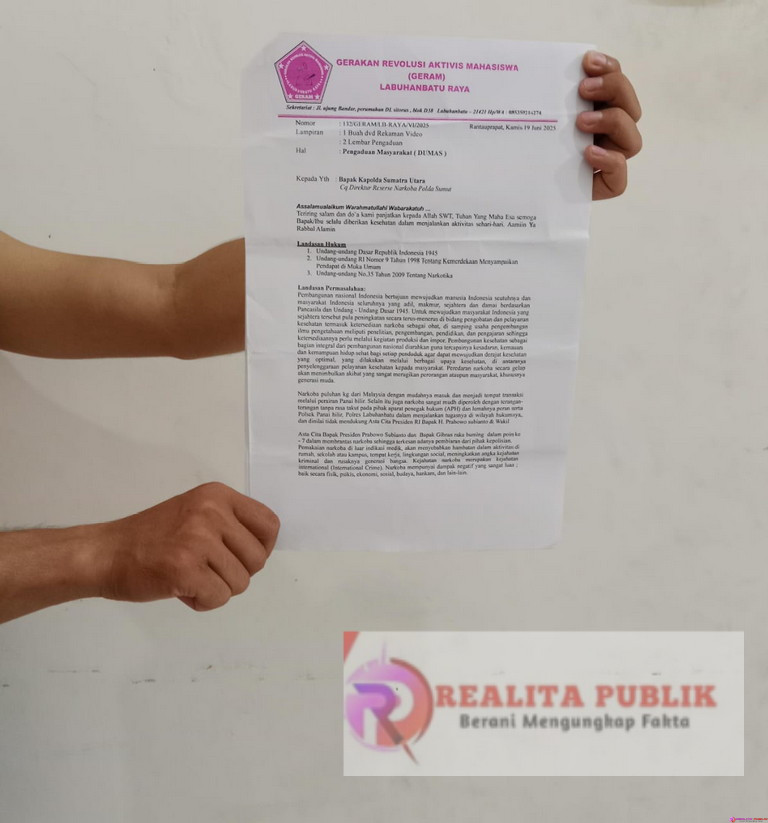 “GERAM melayangkan surat Dumas ke Polda Sumatera Utara perihal dugaan maraknya peredaran Narkoba, pada Kamis 19 Juni 2025. Surat Dumas itu kita tujukan kepada Bapak Kapolda dengan tembusan kepada Bapak Dirnarkoba Polda Sumut,” kata President Executive GERAM Labuhanbatu Raya, Jepril Harefa, Selasa 24 Juni 2025.