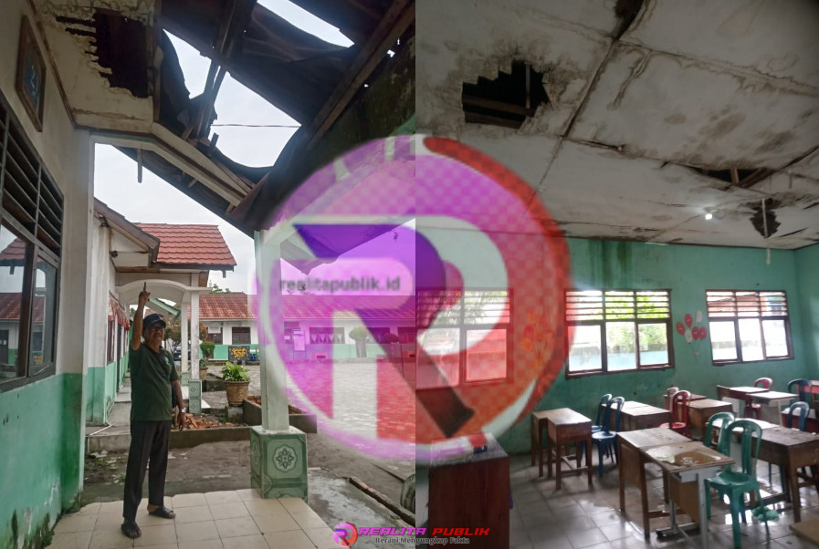 Terlihat, bangunan SD ini pada bagian atap gedung dan plafonnya jebol. Setidaknya ada 5 ruang kelas dan 3 bangunan MCK/toilet di SD tersebut rusak berat pada bagian atap dan plafonnya.