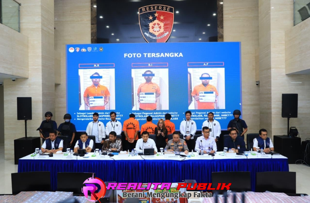 Jakarta realitapublik.id – Direktorat Tindak Pidana Siber Bareskrim Polri berhasil mengungkap sindikat judi online berskala nasional dan internasional yang beroperasi melalui tiga website besar, yakni Slot Bola 88, Raja Spin 88, dan Inibet 77. Dalam operasi ini, penyidik menangkap tiga tersangka, menyita uang tunai senilai Rp16,4 miliar, serta memblokir 76 rekening dengan nilai transaksi mencapai Rp63,7 miliar.