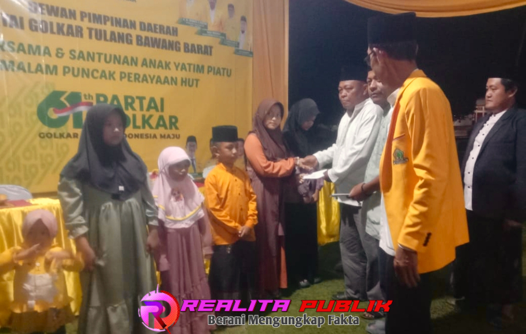 Tulang Bawang Barat realitapublik.id – Malam puncak rangkaian kegiatan Hari Ulang Tahun (HUT) Partai Golkar ke- 61 tahun pada 2025, Dewan Pimpinan Daerah (DPD) II Partai Golkar kabupaten Tulang Bawang Barat (Tubaba) melakukan kegiatan Do’a bersama serta memberikan santunan kepada anak yatim pada Jum’at, 05/12/2025 yang di mulai pada pukul 18:00 wib hingga selesai.