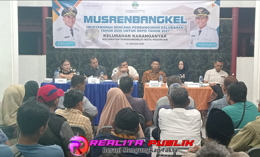 KOTA PASURUAN realitapublik.id — Pemerintah Kelurahan Karanganyar, Kecamatan Panggungrejo, sukses menyelenggarakan Musyawarah Perencanaan Pembangunan Kelurahan (Musrenbangkel) Tahun 2026 untuk RKPD Tahun 2027. Forum yang digelar di balai kelurahan pada Selasa (27/1/2026) malam ini menjadi panggung bagi 60 perwakilan warga untuk merumuskan arah pembangunan masa depan wilayah mereka.