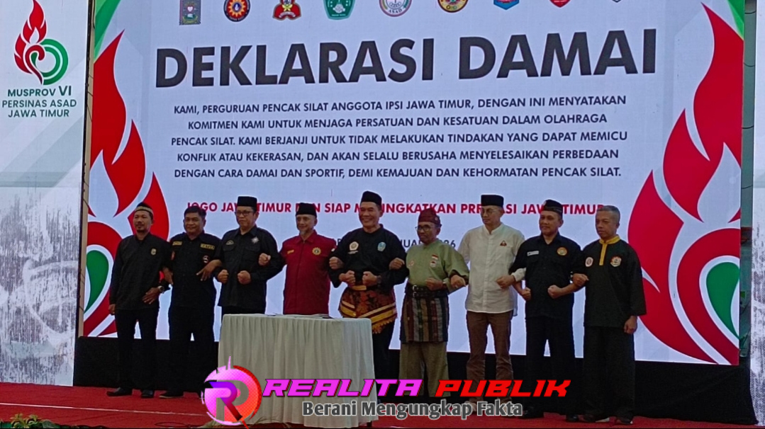 SURABAYA, Realitapublik.id — Iklim persaudaraan antarperguruan pencak silat di Jawa Timur memasuki babak baru. Sebanyak sepuluh perguruan pencak silat yang bernaung di bawah Ikatan Pencak Silat Indonesia (IPSI) Jawa Timur resmi menandatangani Deklarasi Damai Perguruan Pencak Silat Jawa Timur di Kantor Persinas ASAD Provinsi Jawa Timur, Surabaya, Sabtu (31/01/2026).